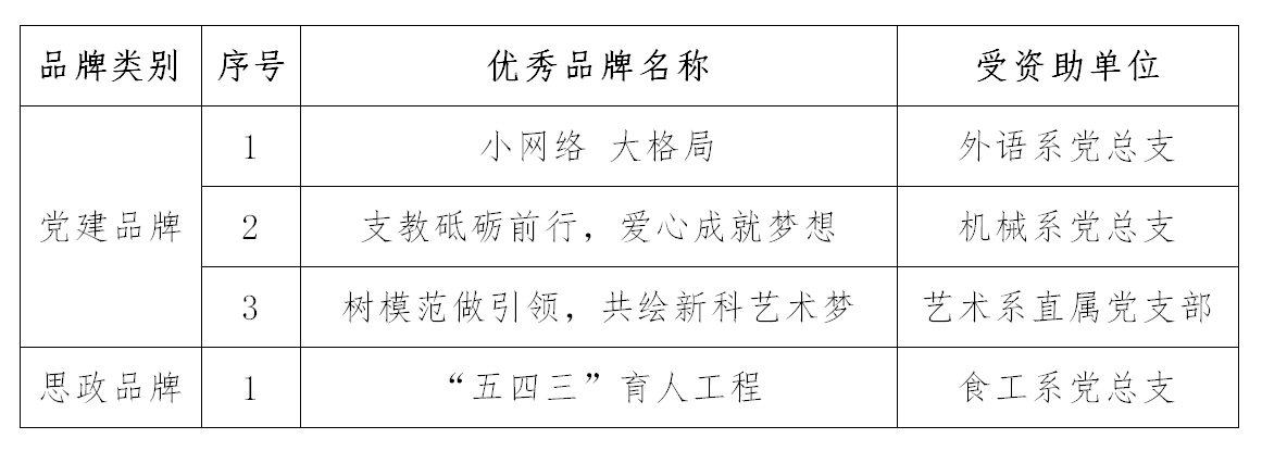 根据我院《关于开展党建品牌、思想政治工作品牌培育工程的通知》(院党字〔2016〕15号)相关要求,各党总支(直属党支部)结合本单位工作特点和实际,认真总结党建工作和思想政治工作特色,并积极申报。经各党总支(直属党支部)申报,评审小组评审和党委组宣部对申报材料进行综合审阅的基础上,报学院党委审批,研究确定优秀党建品牌3个、优秀思想政治工作品牌1个(见附件1)。院党委将对评选出的优秀品牌给予2000元的建设资助,用于进一步丰富品牌的内涵,完善机制,细化措施,推动品牌创建持续深入开展。对2017年实施效果优秀品牌(见附件2)追加1000元经费支持。